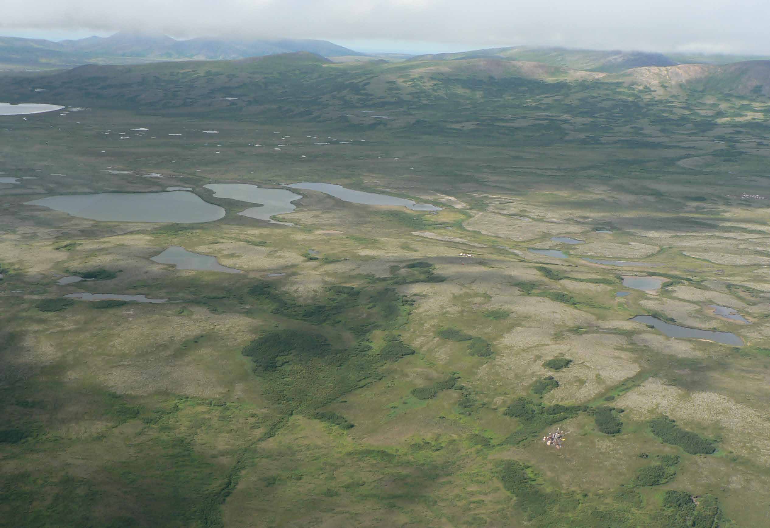 In the lower right portion of this photo of the Pebble prospect, a small exploration drilling site is visible. The copper and gold prospect is located 200 miles southwest of Anchorage on state land set aside for its mineral potential.